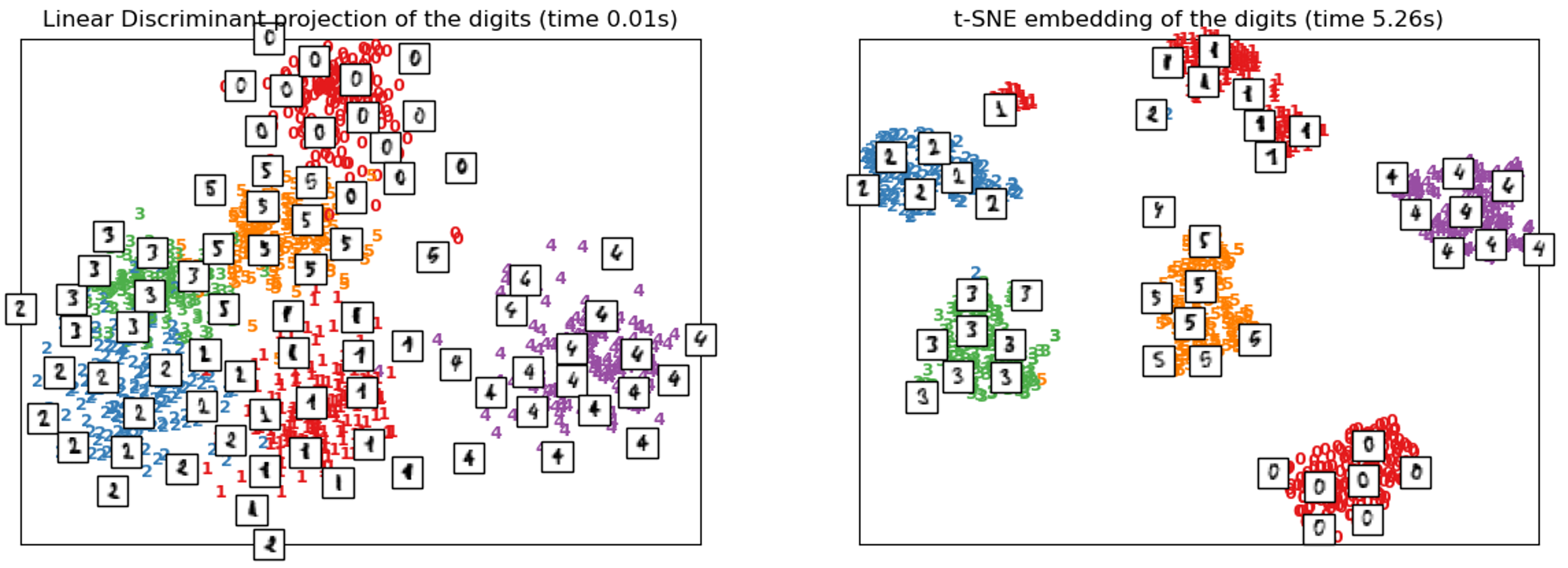 t-SNE在计算上非常昂贵(比较上面图表中的运行时)。对于一百万个样本数据集,它可能需要几个小时,而PCA可以在几秒钟或几分钟内完成。