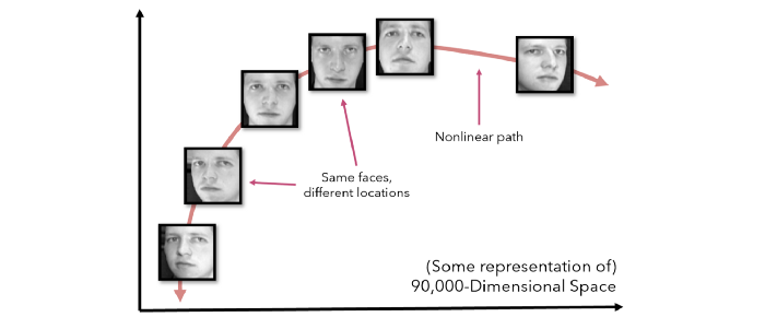 为了把事情放在上下文中,考虑300×300像素的头像。在完美的条件下,每个图像都会完美地居中,但实际上,还需要考虑许多额外的自由度,例如灯光或脸部倾斜。如果我们把一个头像当作90000维空间中的一个点,改变各种效果,比如倾斜头部或朝不同的方向看,会使它在空间中非线性移动,即使它是同一类的同一个物体。