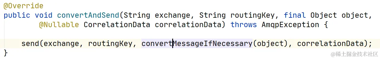 template.convertAndSend("queue","hello");实际调用了下方的方法,convertMessageIfNecessary会根据设置的消息转换将普通对象转换为Message对象。