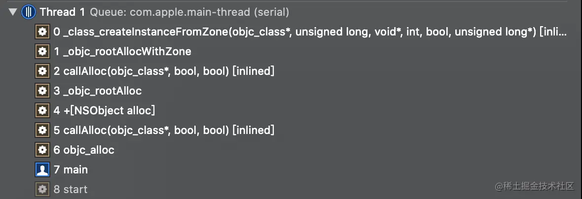 在NSObject.mm类alloc方法中添加断点,得到的堆栈如下