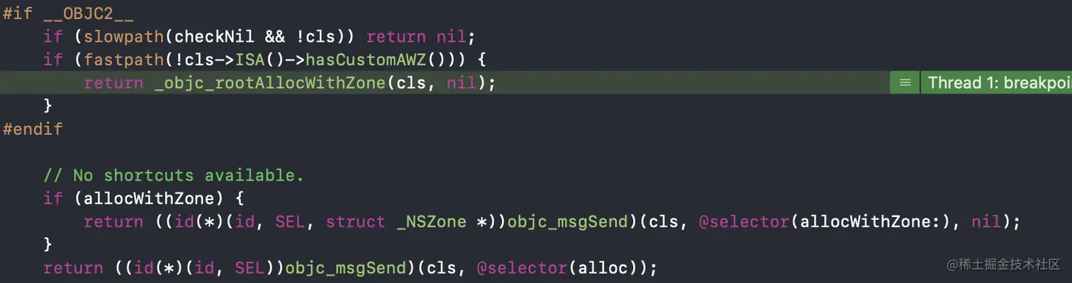 我们在看看具体的方法里都做了什么,首先我们看到调用的是objc_alloc