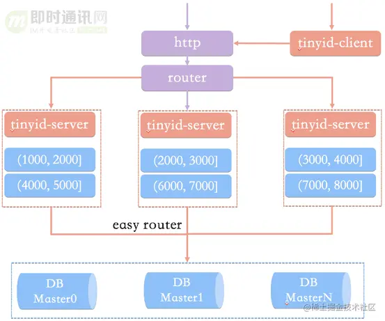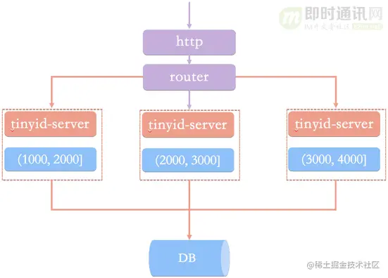 如上图,id生成系统向外提供http服务,请求经过我们的负载均衡router,到达其中一台tinyid-server,从事先加载好的号段中获取一个id。