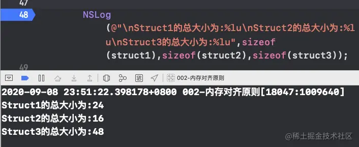 同样由内存对齐规则三:结构体的总大小,必须是其内部最大成员的整数倍,不足要补齐.所以Struct3结构体的总大小为48.
