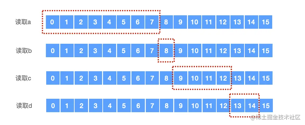 CPU在读取数据时,首先从内存读取粒度8开始读取,读出了a的数据,然后使用同样的读取粒度读取后边的数据时,发现b、c、d读不到,所以要修改内存读取粒度,从8降到4,这时读取b就包含了c的数据,这是不对的,直到修改内存读取粒度为1时,才能读得到b,接下来读c时,内存读取粒度就不够了,需要加大粒度值两次到4,才能读取到c...