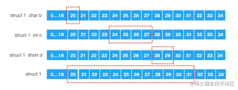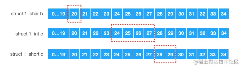 其内部最大成员数据类型所占内存大小的整数倍地址开始存储.所以struct1开始存储的位置不从17而是从20开始。如下: