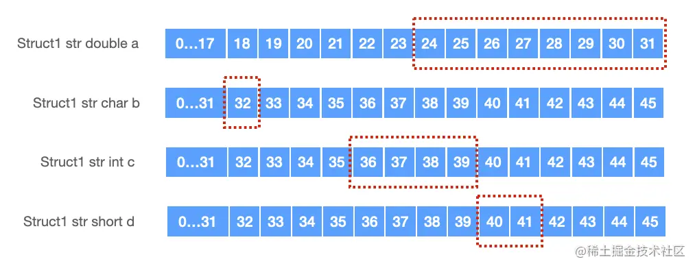 Struct1结构体中最大的数据类型是double--8字节,存储到d的位置在17.所以存储Struct1结构体第一个数据double a时,18、19、20、21、22、23都会被padding.具体如下: