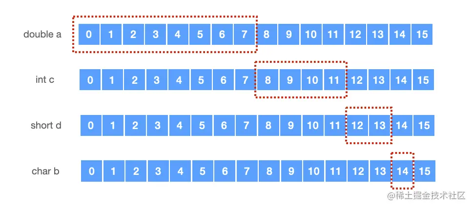 double a由规则1,第一个数据成员a,会从偏移量0的位置开始,占据了8个字节