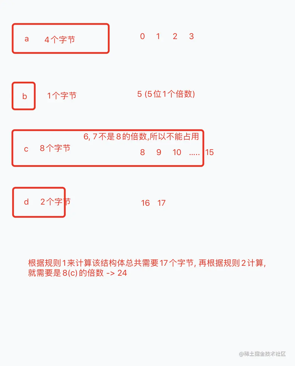 2: 基于第1点计算出的实际内存大小应转换为 <该结构体> 中 <占用空间最大> 的成员变量的整倍数;
