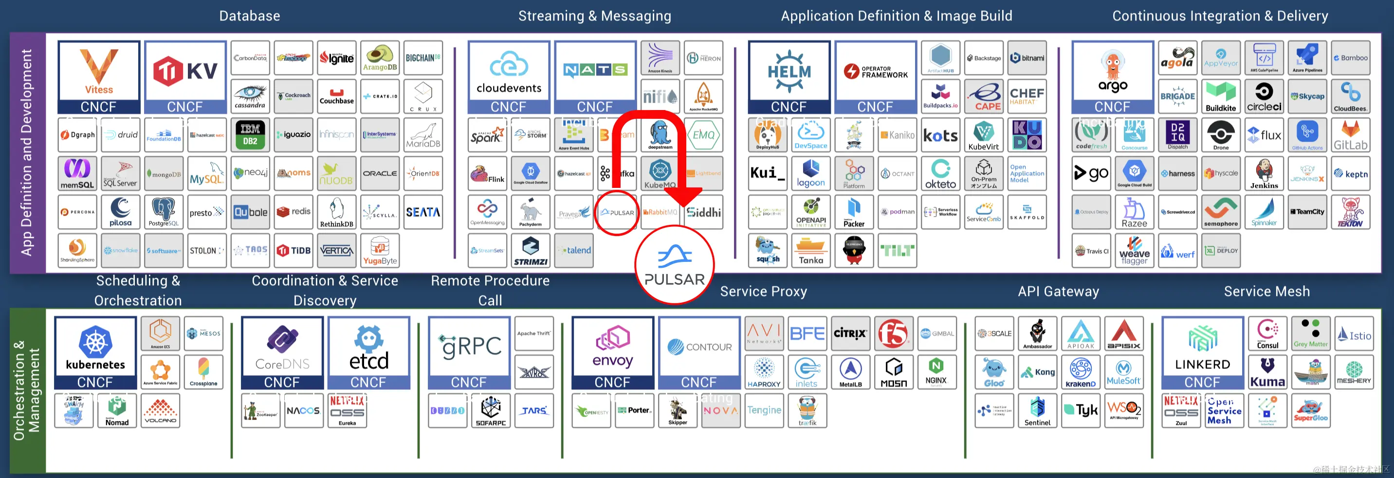 Landscape 是 CNCF 的重要项目,目的在于为云原生应用者提供技术线路图。通过对云原生技术中的大多数项目和产品进行分类,追踪云原生生态中的大量技术与应用。Pulsar 入选 CNCF 云原生全景图,说明 Pulsar 已获得行业权威机构的高度认可。