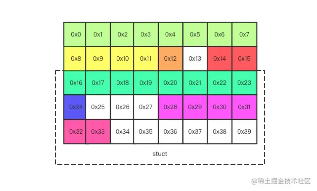 变量 stuct:stuct是一个结构体,根据内存对齐原则二,结构体成员要从其内部最大成员大小的整数倍开始存储,而Struct2中最大的成员大小为8,所以stuct要从8的整数倍开始,当前是从15开始,所以不符合要求,需要往后移动到16,16是8的整数倍,符合内存对齐原则,而stuct的内存大小是24,所以 16-39 存储 stuct