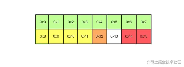 变量d:占2个字节,从13开始,此时min(13,2),13不能整除2,往后偏移,即 14-15 存储 d