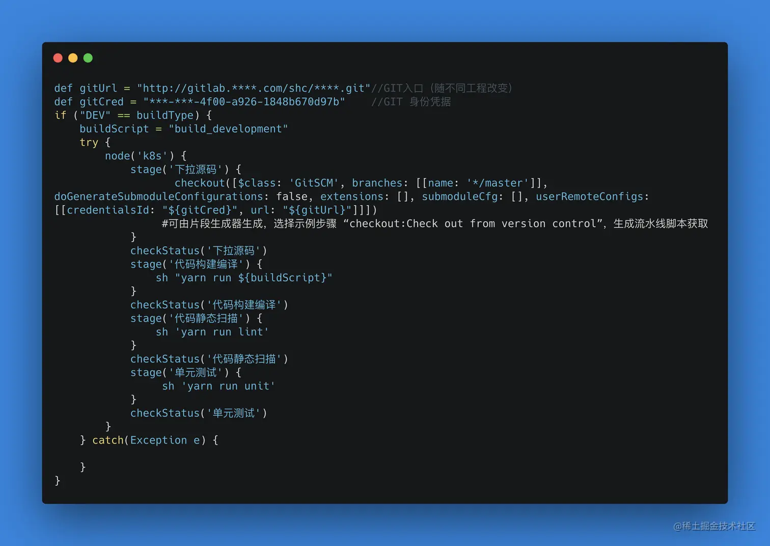 下面介绍一个简单版的jenkinsfile的流水线任务写法,完成整个前端工程化部署涉及的编译打包、静态扫描、单元测试等环节