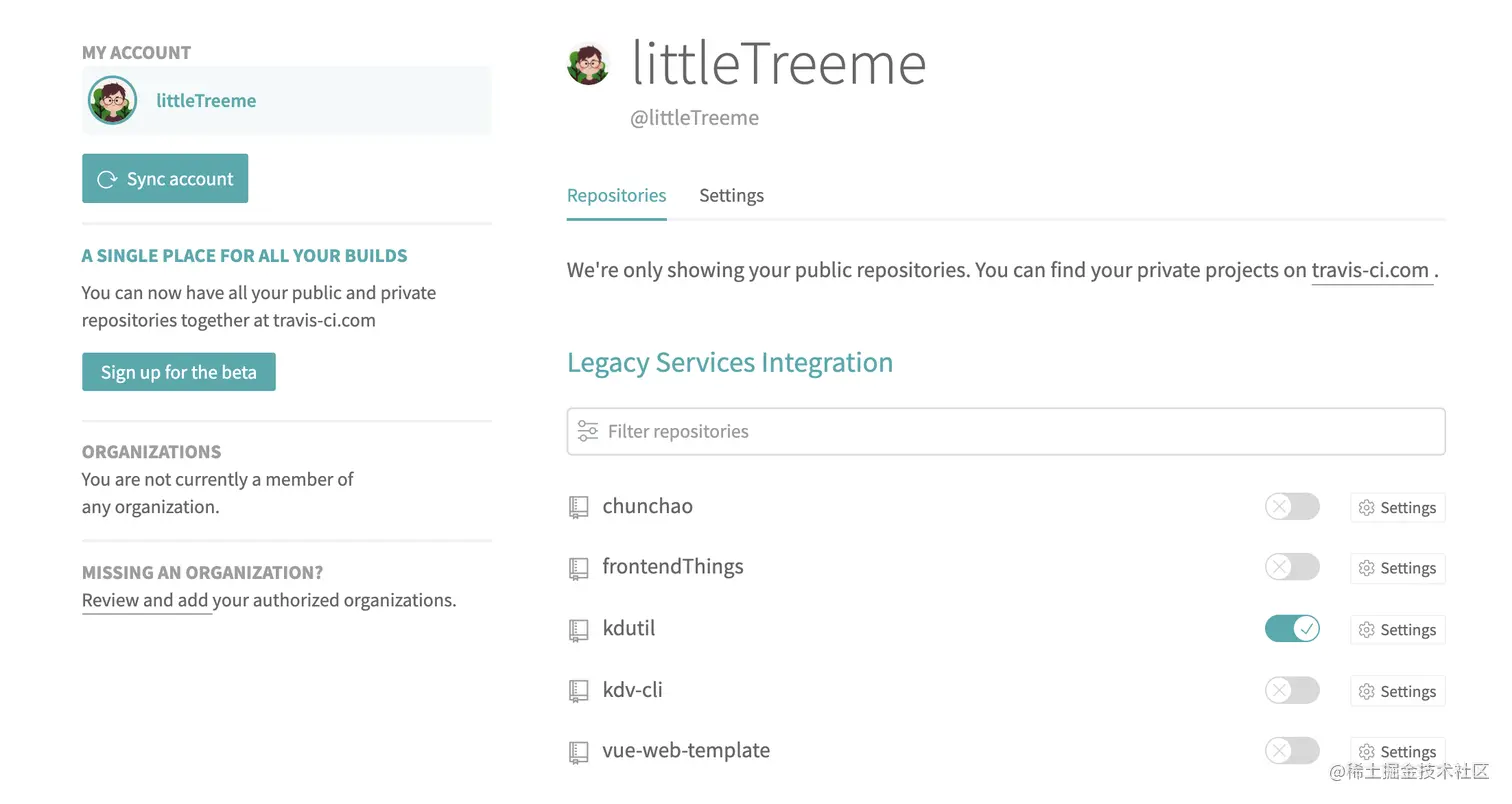 1.需要在travis-ci.org注册好你的专属travis-ci账号,然后绑定你的github,登陆后选择你要集成的项目