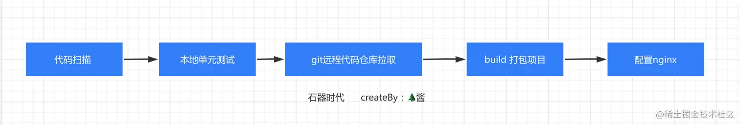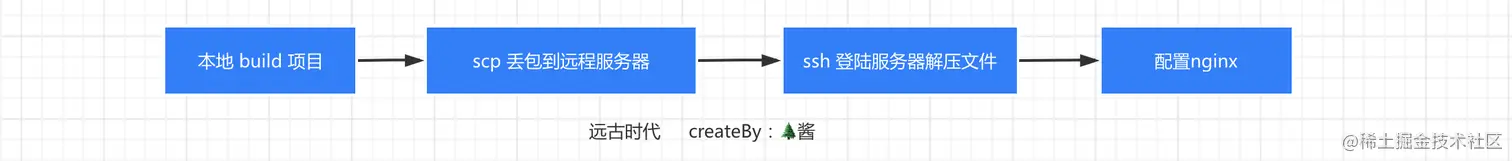 我们知道,对于一般的SPA应用,本质是静态资源(后端渲染SSR忽略),执行build命令,把项目打包build一下完,压缩打包之后的文件,ssh连接服务器并把压缩好的文件“丢”到服务器,解压上传的文件,最后配置下Nginx即可访问到该项目的资源,石器时代我们是这样走流程的,流程如下