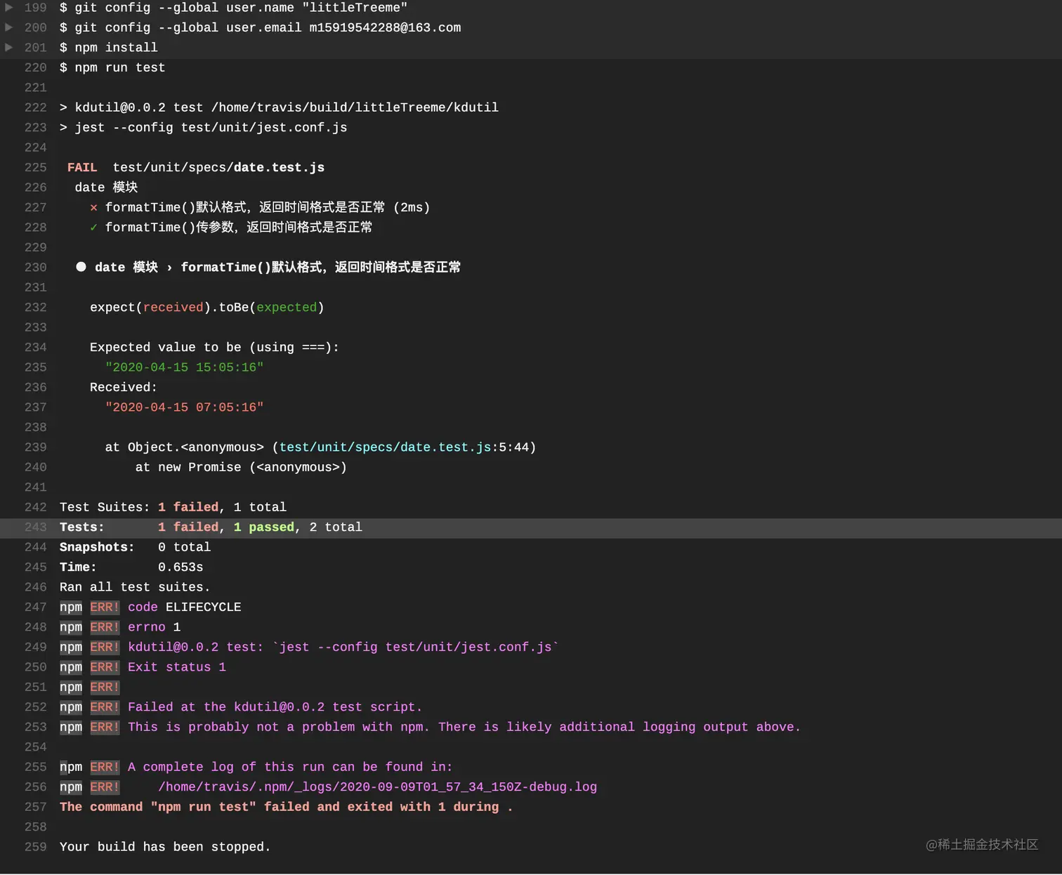 项目在构建与测试多多少少会出现失败的情况,下面是一个实际的单元测试出错例子,一旦出错则中断CI行为(因为树酱将单元测试命令配置在install阶段)