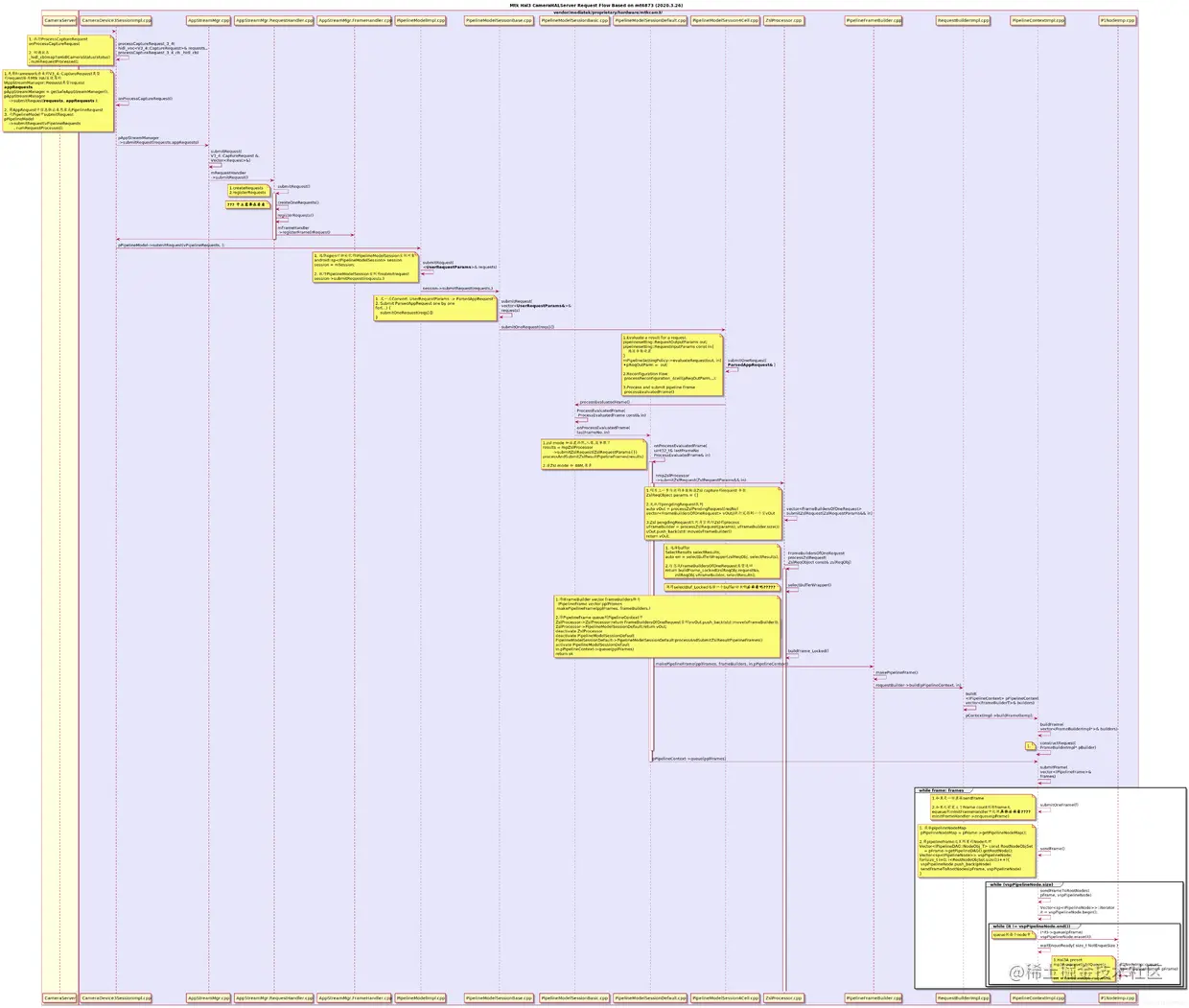 HWNode是大Node,三方算法的挂载在这些node里面,作为小node. P1Node负责输出raw图,P2CaptureNode主要负责拍照的frame的处理,P2StreamingNode主要负责录像预览的数据处理,JpegNode的输入时main YUV、Thumbnail YUV及metadata,输出是Jpeg及App metadata。