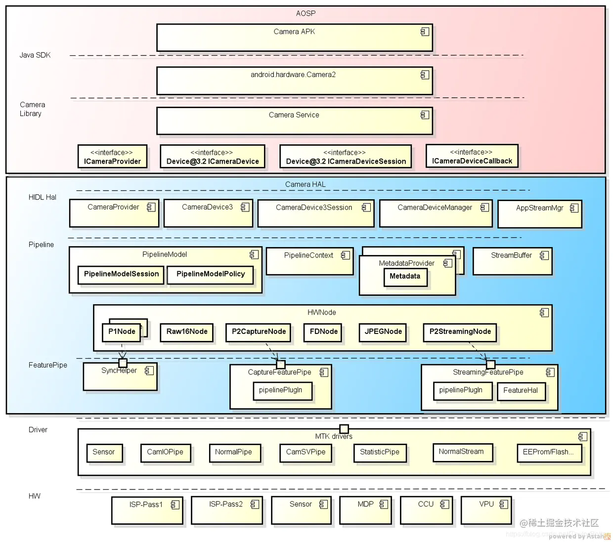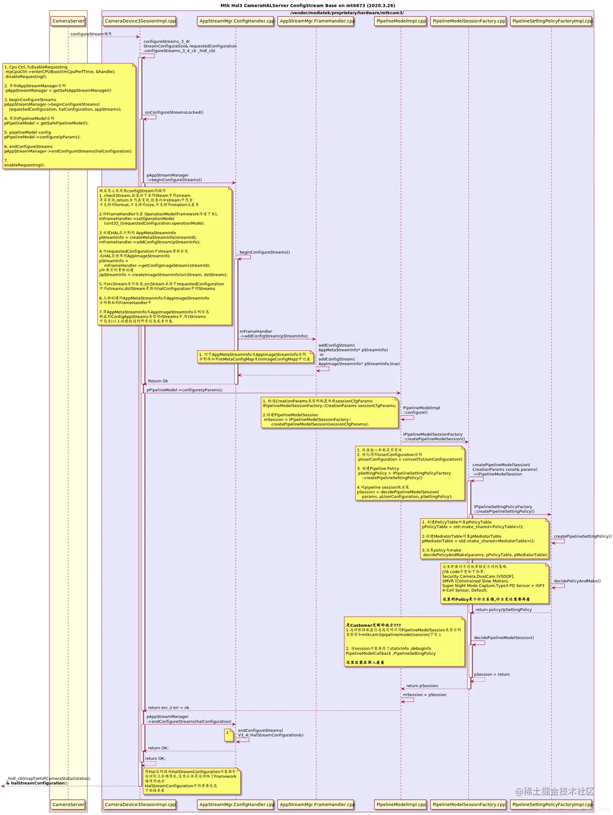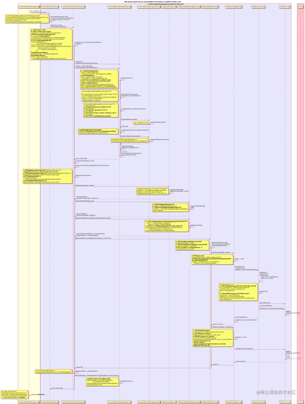 MtkCam3实现了Android定义的几个HAL3的接口:ICameraProvider, ICameraDevice, ICameraDeviceSession, ICameraDeviceCallback;ICameraProvider 的实现类CameraProviderImpl包在 camera device manager 外围,只是一个 adapter, 适配不同版本的 camera device interface。 Camera Service(指的是camera android层的进程: cameraserver ) 可以通过 ICameraProvider 去拿到 ICameraDevice 。ICameraDevice 和 ICameraDeviceSession 的实现类 CameraDevice3Impl, CameraDevice3SessionImpl 。用于Camera Service 去操作每一个 camera。 比如: open, close, configureStreams, processCaptureRequest 。