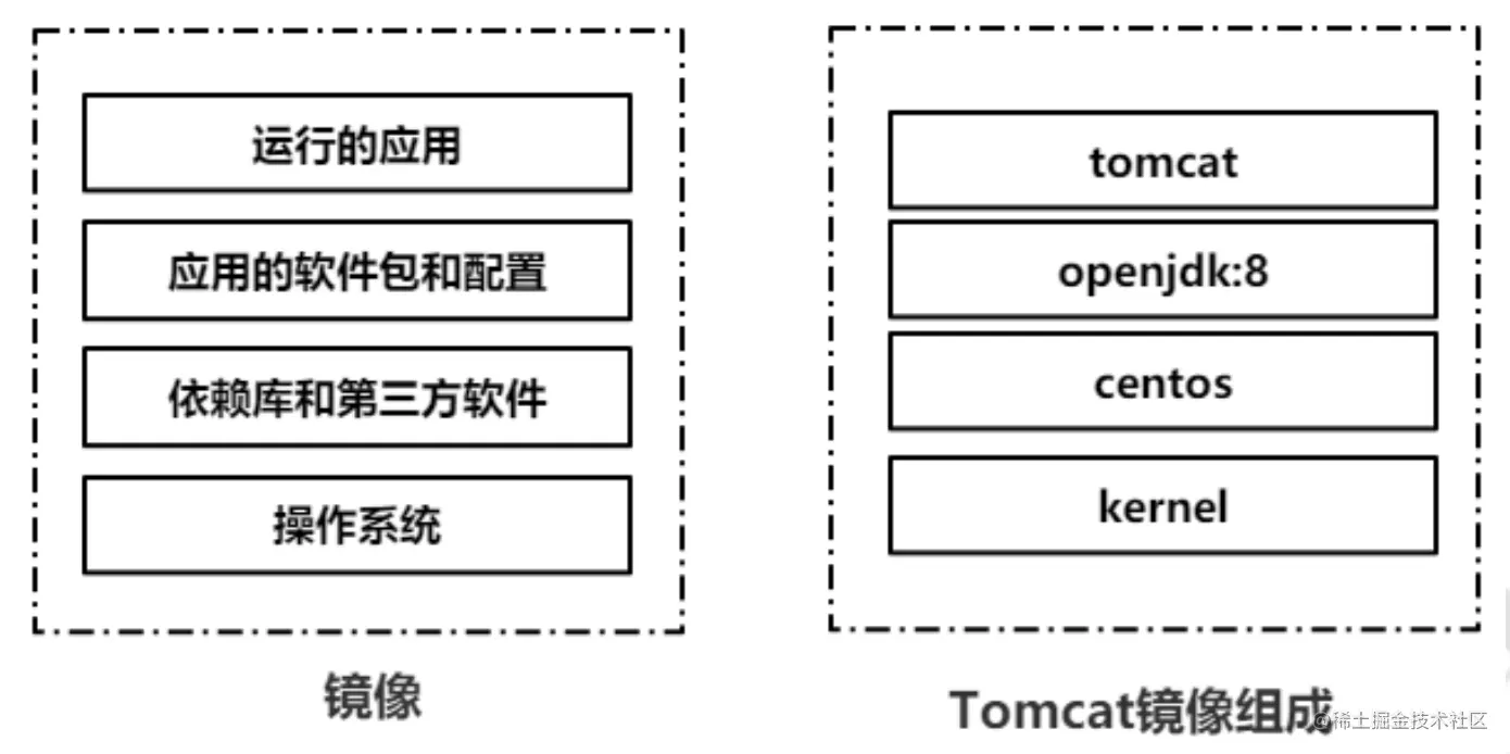 Docker容器镜像包含了运行该应用程序所需要的一切因素,如代码、运行环境、系 统工具、系统库,它的组成形态如下图所示。