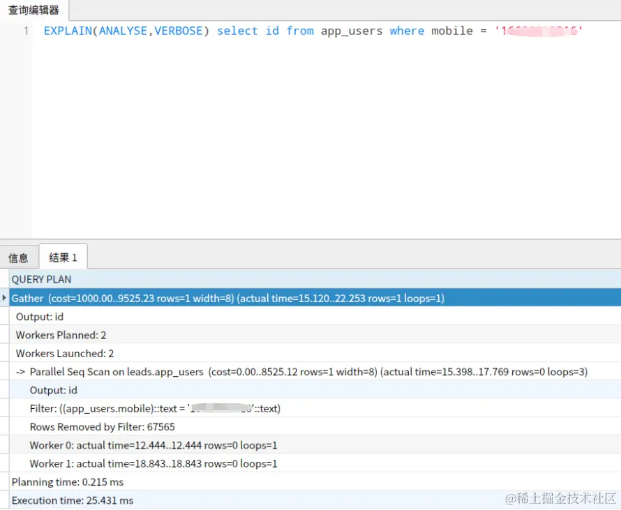 - Execution time: 表明了实际的SQL 执行时间,其中不包括查询计划的生成时间