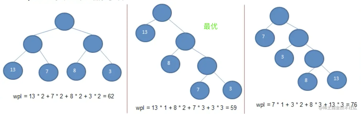 - 树的带权路径长度:树的带权路径长度规定为所有叶子结点的带权路径长度之和,记为 WPL(weighted path length) ,权值越大的结点离根结点越近的二叉树才是最优二叉树。