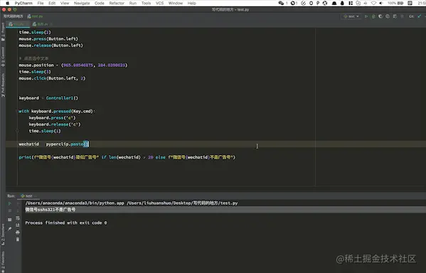 在上面的过程中,值得说的是最后一步,复制我们可以使用pynput中的键盘控制器,在双击选中对应微信号之后通过下面的代码实现模拟键盘输入Command + C完成复制操作