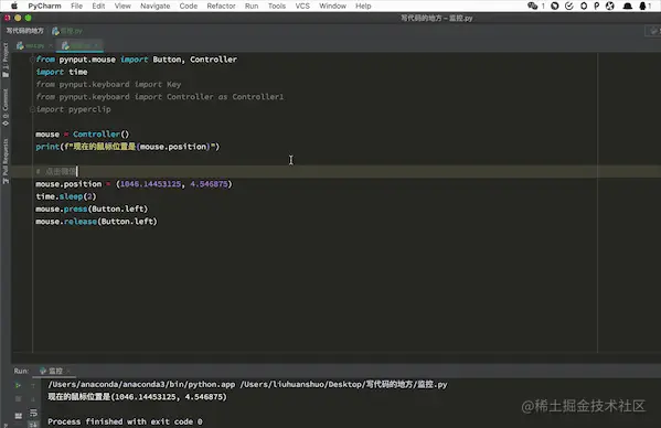 下面简单说一下这个库,因为没有太多依赖库所以安装起来很简单,直接pip install pynput即可,使用起来也很简单,对于鼠标操作只依赖坐标,看个demo👇