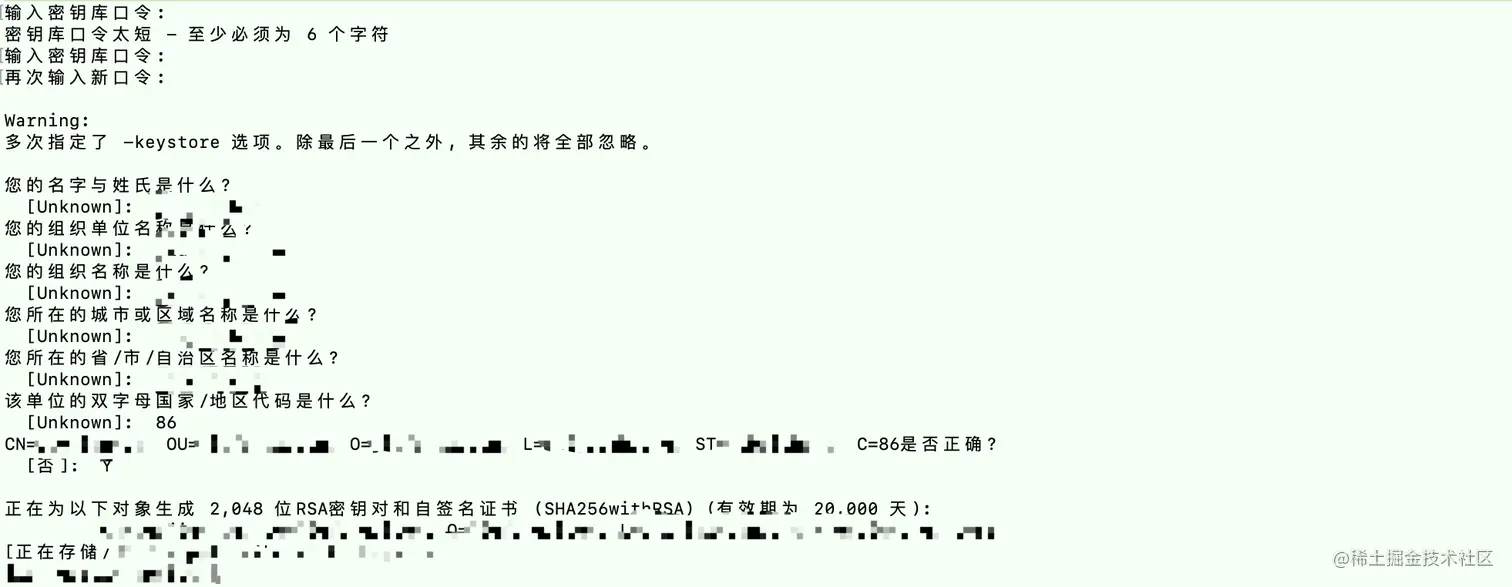2、再输入 keytool -genkey -v -keystore 证书名.keystore -alias 证书别名 -keyalg RSA -validity 20000 -keystore /Users/用户名/证书名.keystore 回车