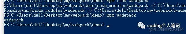然后初始化另外一个项目demo,要先安装webpack和webpack-cli,接着在wadepack项目下执行npm link,结果: