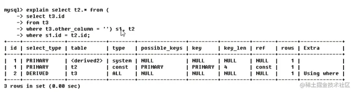 - union 第二个select语句标记在union之后, 则被标记为union, 若union包含在from子句查询中,外层select会被标记为 derived