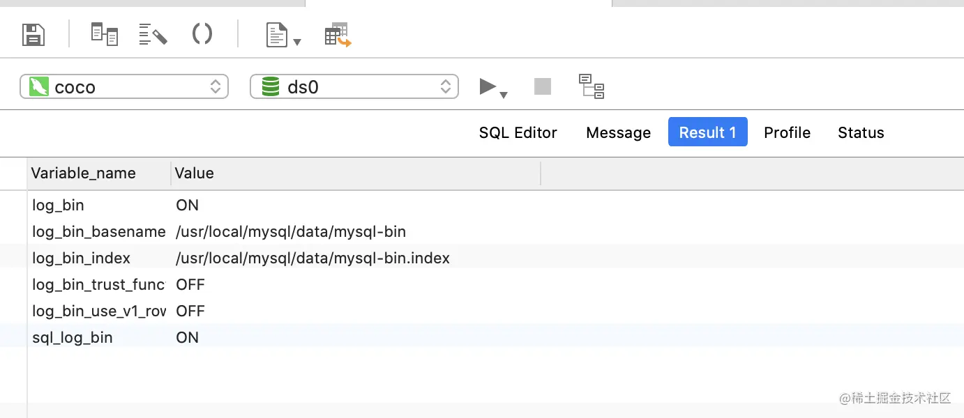第一项log_bin 是打开的,如果没打开就先自行百度一下,还有就是要记住一个路径,就是图中的/usr/local/mysql/data目录,因为等会binlog日志生成的日志就是在该目录下。