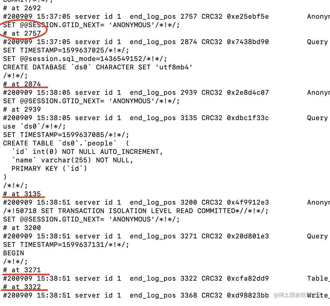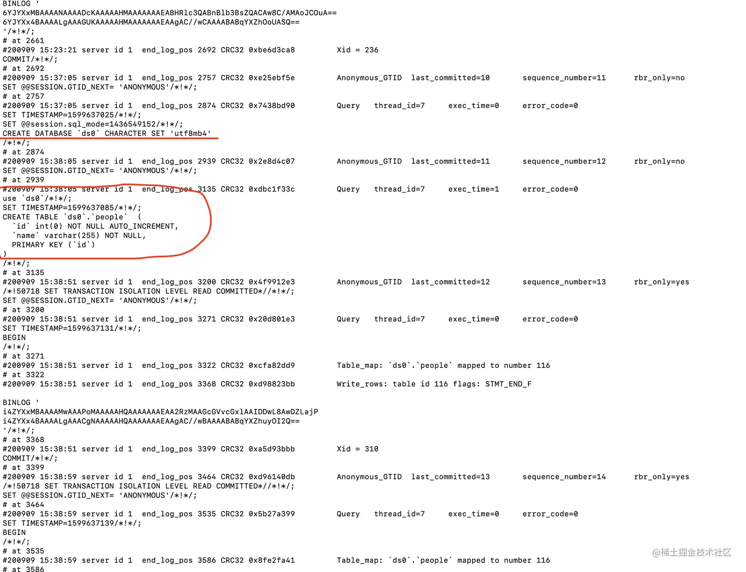 这里只是截取了一部分,可以看到我们创建数据库和表的语句。现在我们就把ds0整个数据库删除掉,删除掉之后就可以使用binlog日志进行恢复了,在上图中有很多这样的内容