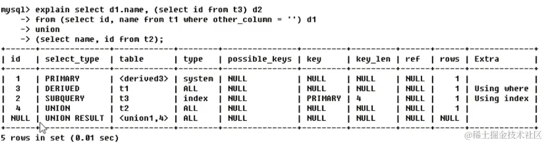 - id = 2 t3表用到了主键, 覆盖索引, 行数为1 select id from t3