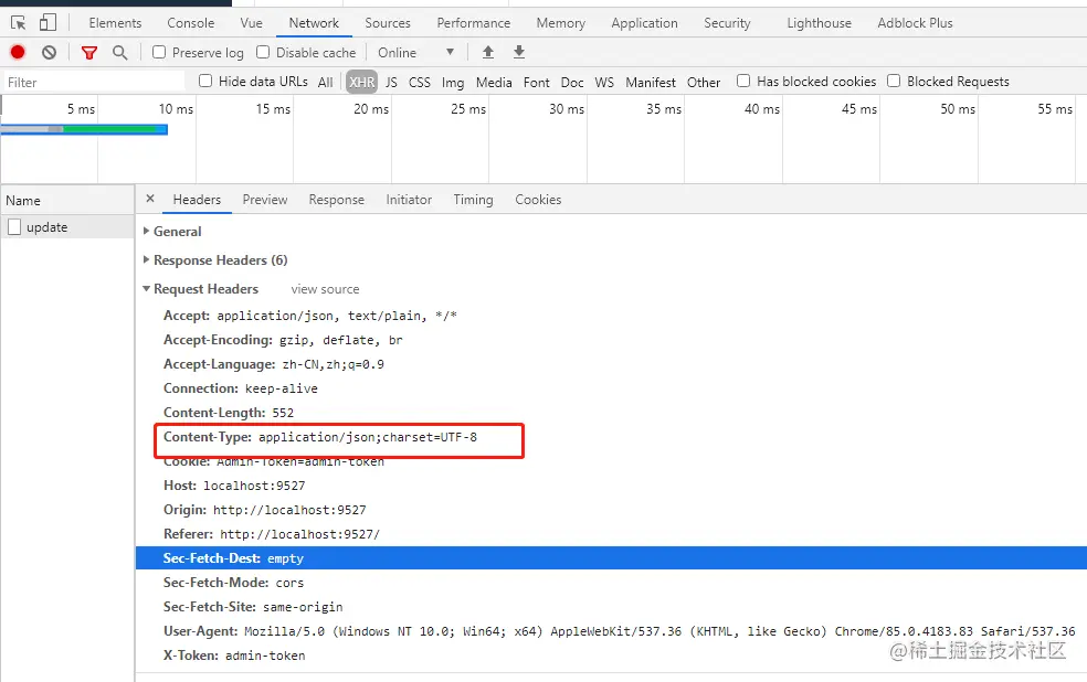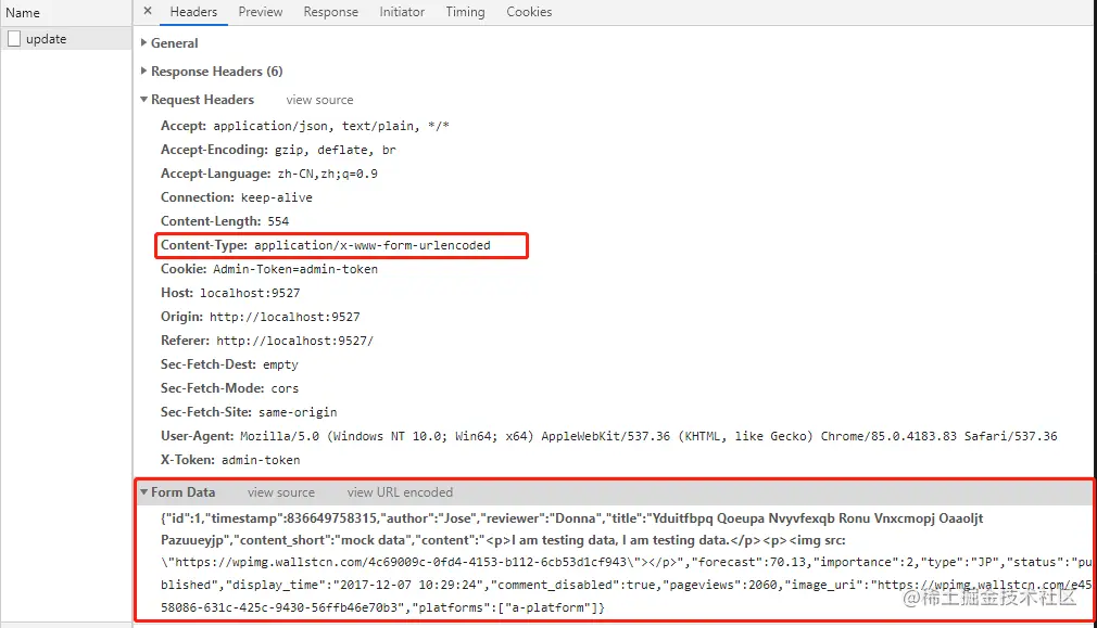 设置之后看到请求时的 Content-type 变成了 application/x-www-form 格式,但是数据依旧是 json 格式,且依旧请求失败