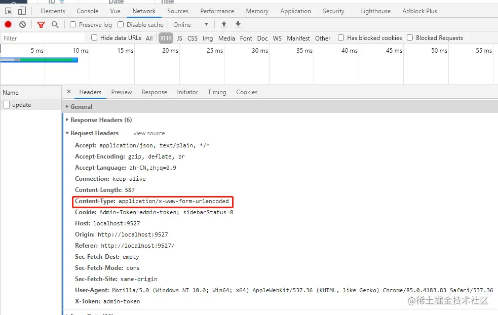 但是有的时候,后台需要 Form 形式的数据才能正常解析,所以前端需要在传过去时修改一下格式。开始我以为是修改 Content-Type 属性,于是就: