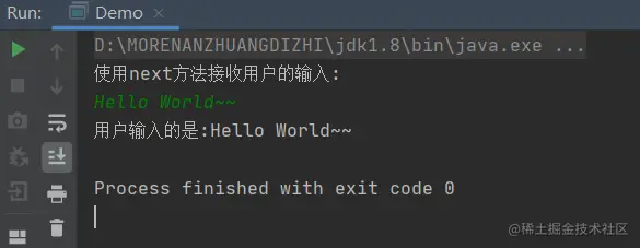 修改完成后再次在控制台进行测试,得到了完整的Hello World (nextLine以回车为结束符,可以接收到我们输入的全部字符串)。