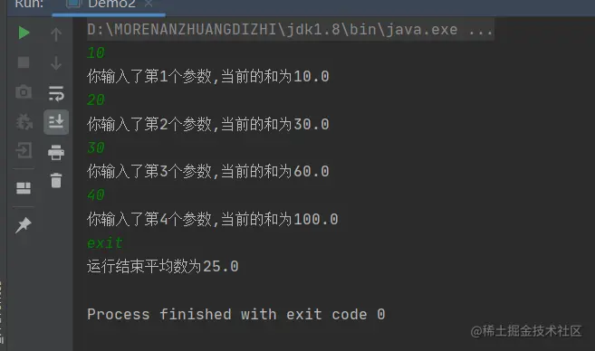运行后我们可以输入多个参数来求和,运行结束(输入非double类型的参数就可以退出)后会求出平均值(会存在精度问题)。