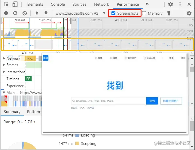 - 在录制之前,勾选Screenshots选项,录制结束后,鼠标悬浮至黄色框内区域时,就可以查看每一帧的屏幕截图啦,可以用于参考实时页面状态