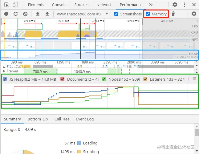 - 在录制之前,勾选Memory选项,录制结束后,会显示页面在这段运行时间内的内存情况和document、DOM节点数、事件监听数的计数(蓝色和绿色框内)