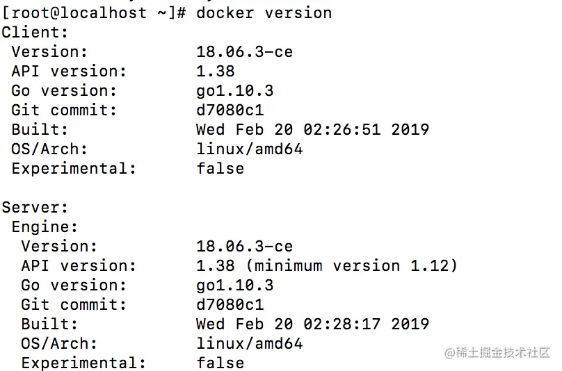 8. 验证安装是否成功(有client和service两部分表示docker安装启动都成功了)