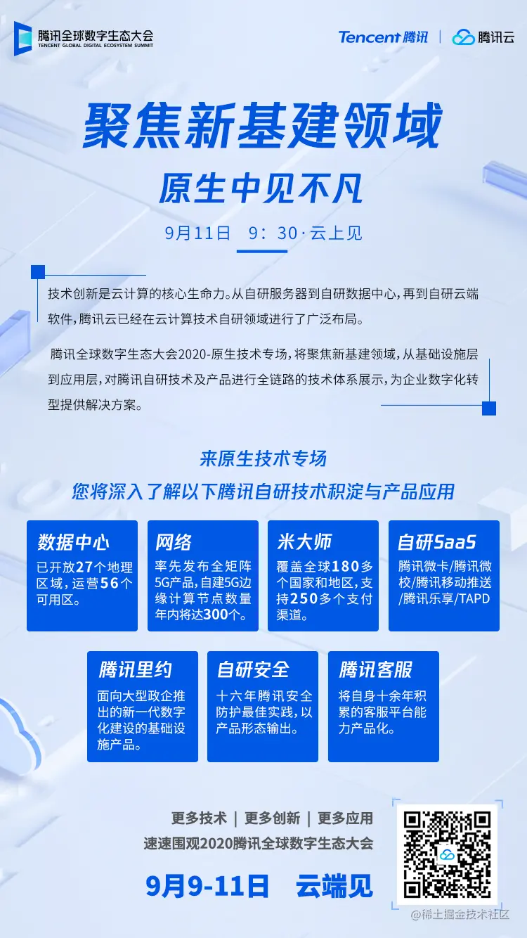 2020腾讯全球数字生态大会|聚焦新基建 原生见不凡 腾讯技术资讯 2020-09-09 355 阅读1分钟 自主创新是云计算的核心生命力, 也是云厂商的核心竞争力! 从服务器到数据中心,再到云端软件, 腾讯云如何在自研领域进行布局? 来原生技术专场, 分享腾讯自研技术积淀与产品应用未来! 9月11日,9:30,云上见!