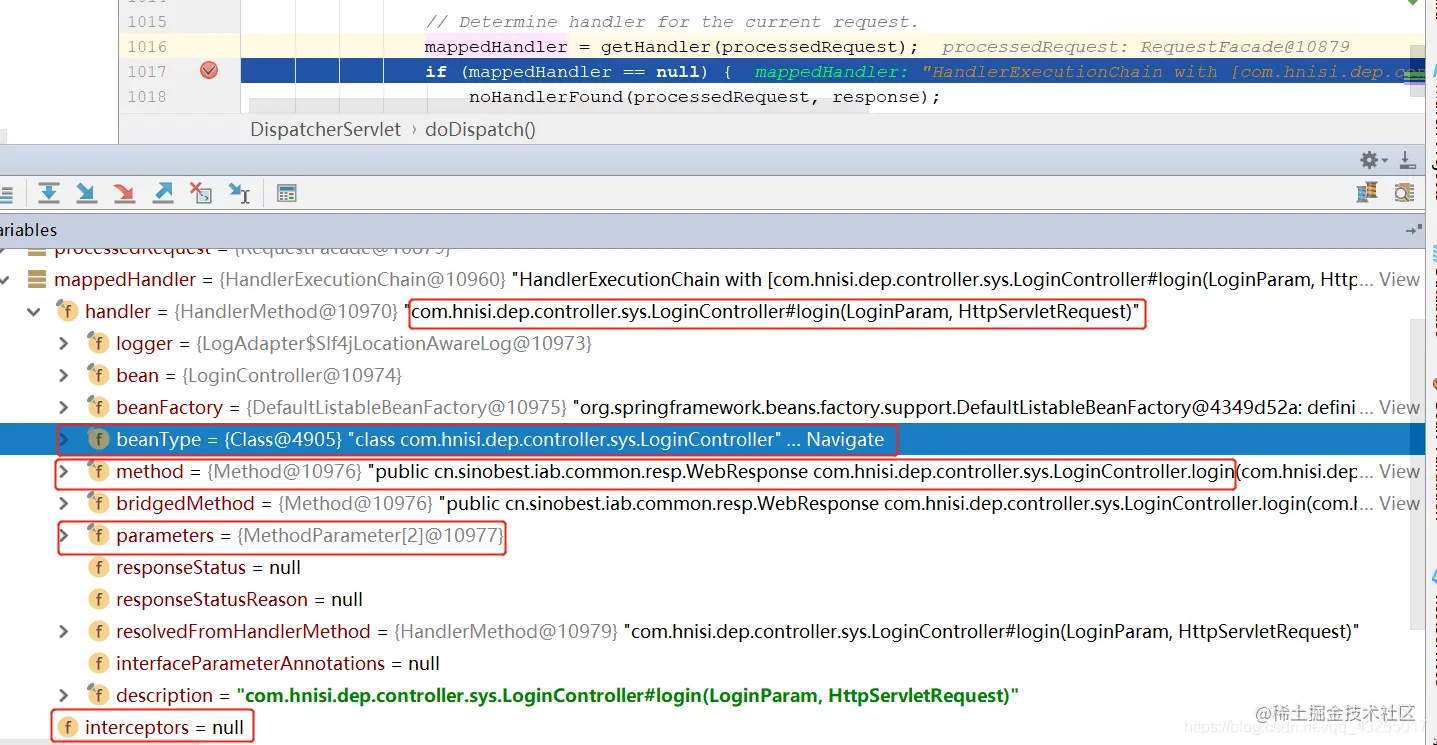 同时包含LoginController的BeanType,前端要请求的方法,以及参数这个元数据信息,简单的概括就是:HandlerExecutionChain里面handler就是我们要请求的Controller以及和一些interceptors信息。