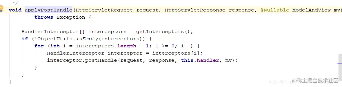 获取到ModelAndView之后,接着就执行我们的拦截器的后置处理方法postHandle。