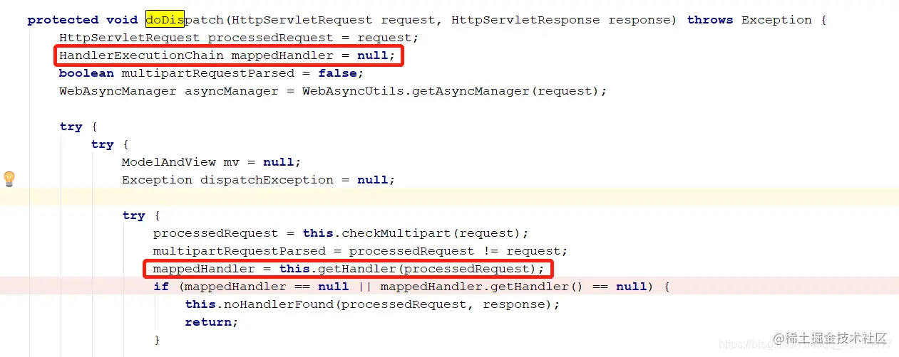 上面说到SpringMVC的核心调度器就是DispatcherServlet,负责主流程的调度工作,在DispatcherServlet里面最主要的方法就是doDispatch: