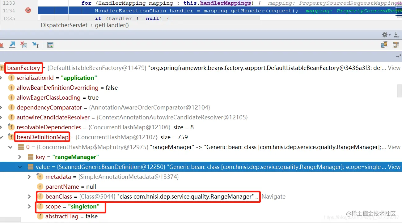 这个就是HandlerMapping对象,主要包含着的Bean映射规则、Bean详细信息。