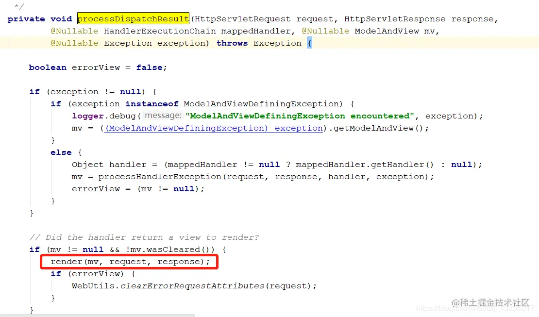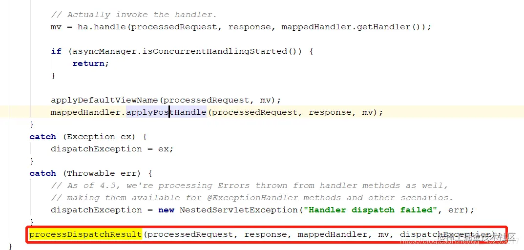 执行完所有拦截器的后置处理方法,就是最后䣌视图的渲染,这里执行的是processDispatchResult方法,并把ModelAndView对象作为参数传递进去。