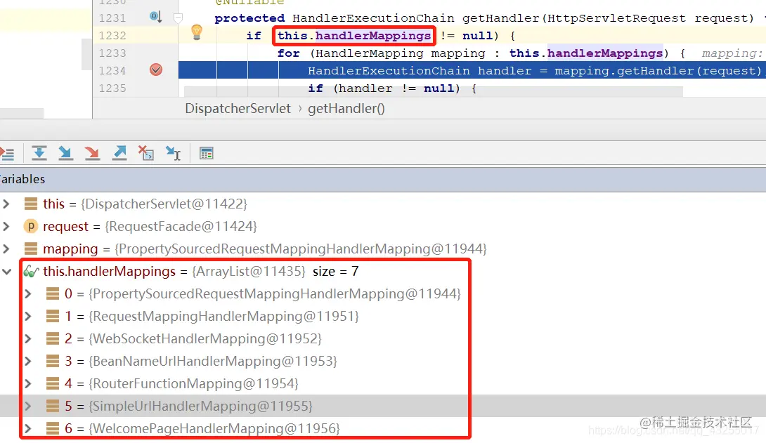 handlerMapping是一个List对象,里面主要是这七个成员信息,我们比较熟悉的就是