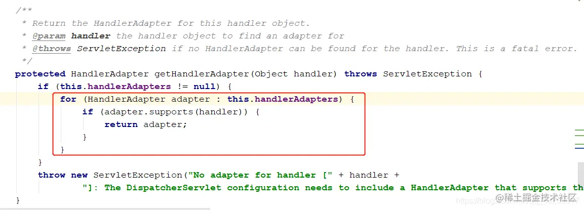 getHandlerAdapter的方法中可以看到,根据返回的handlerMapping对象中的handler对象来获取对应的HandlerAdapter对象,直接返回。