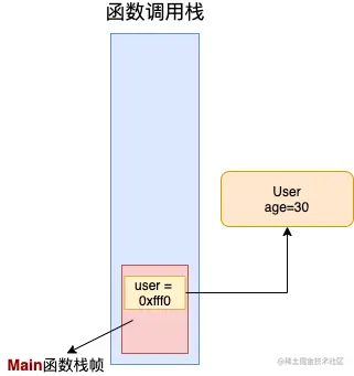 changeUser执行结束,changeUser栈帧弹出,回到Main函数,此时Main栈帧中的user变量的值仍然为0xfff0,指向User对象,没有受到任何影响。
