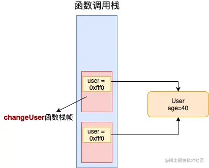 changeUser函数,创建了一个新的栈帧并在其局部变量表里新建了一个变量user,复制Main栈帧中user变量的值给到changeUser栈帧中的user变量,也就是0xfff0,为User对象在堆中的地址。 -