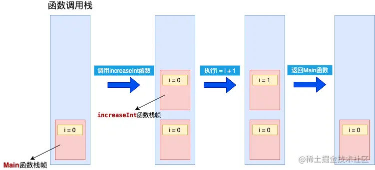 - 调用increaseInt函数时,会在栈中新建一个栈帧,并在该栈帧的局部变量表中新建一个变量i,将Main栈帧中i的值复制一份给到increaseInt栈帧中的变量i。